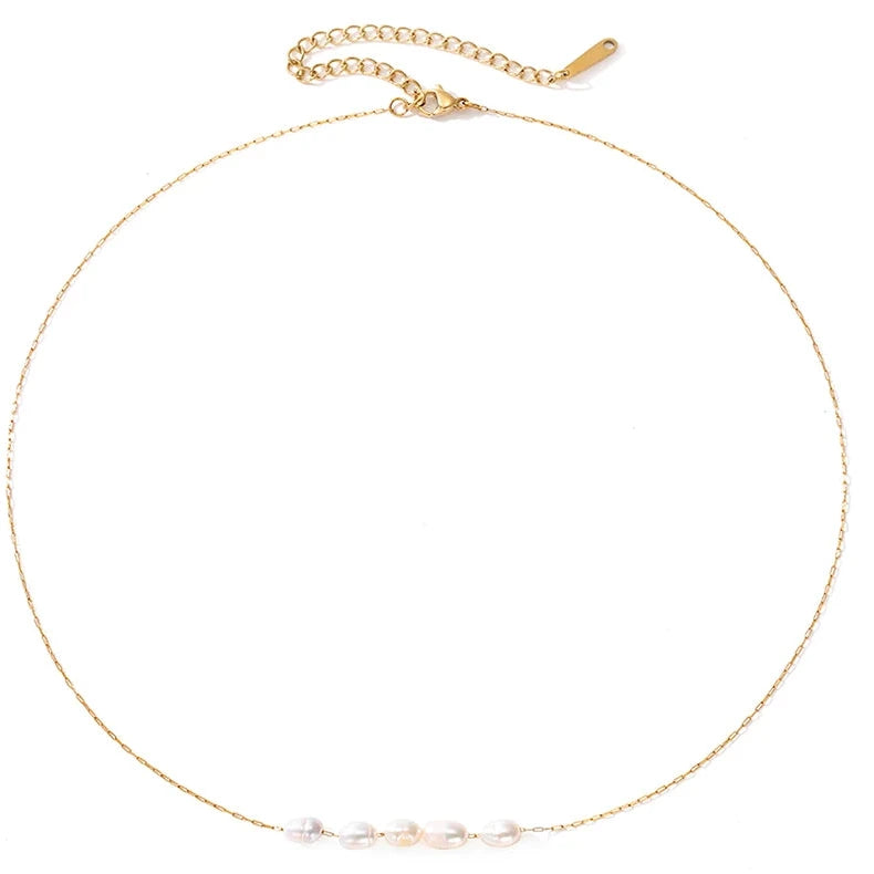 השרשרת מעוטרת בחמישה פנינים זוהרות. עיצובה הייחודי משלב תחכום ופשטות, מה שהופך אותה לאביזר מושלם לכל אירוע מיוחד או למתנה יוצאת דופן למישהי אהובה.